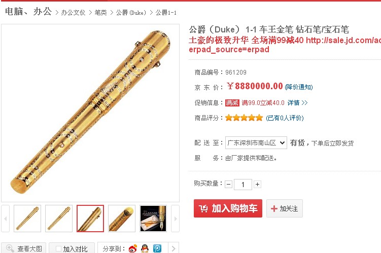 而今日看到京東網(wǎng)爆最貴天價(jià)金筆8880000元的價(jià)格,以18K黃金打造而成,368顆熠熠生輝的天然鉆石群,描繪真F1創(chuàng)造的368公里的速度,4顆天然藍(lán)寶石點(diǎn)綴著來著四方車迷的激情。讓國(guó)際大都市伴隨F1賽車,在“上”字賽道上創(chuàng)造時(shí)代的極速。作為新新人類再一次亮瞎了眼。