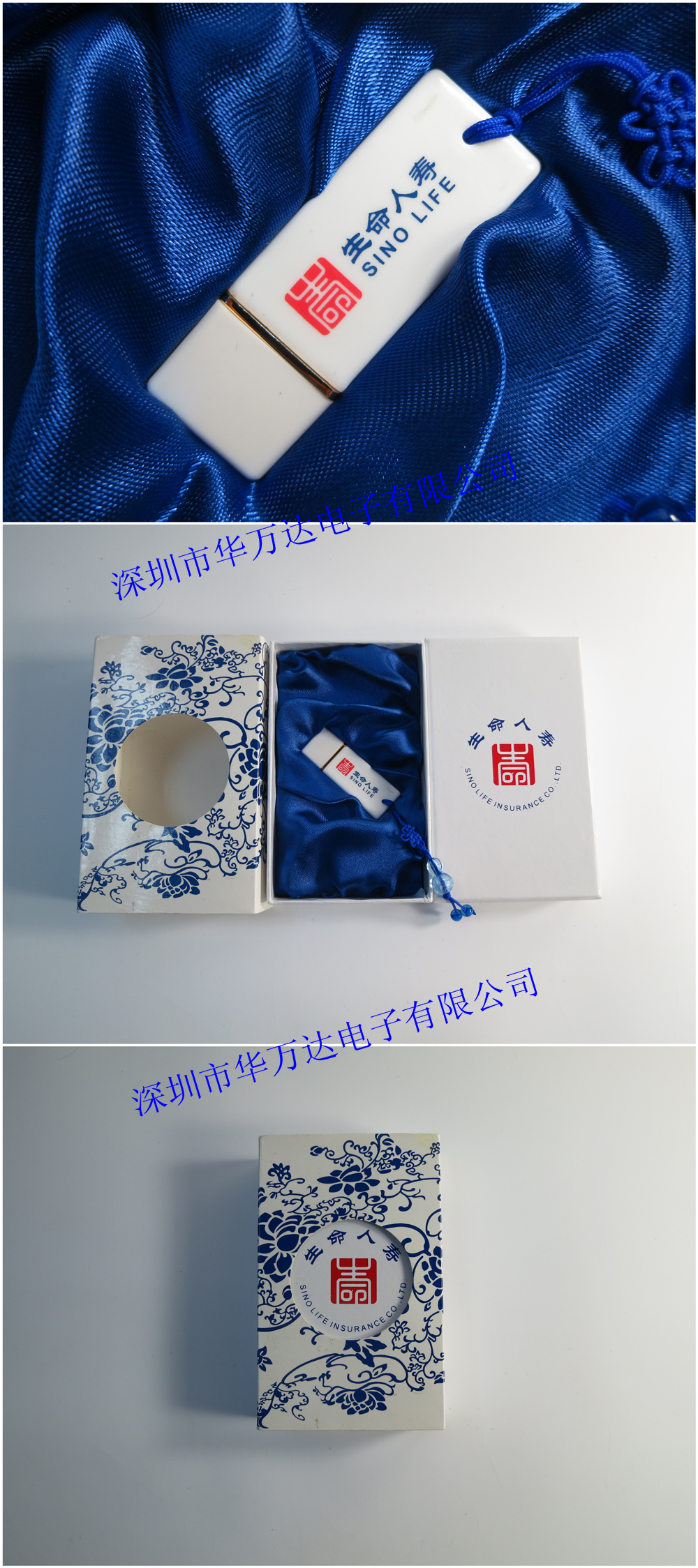 生命人壽保險(xiǎn)股份有限公司是一家全國(guó)性的專業(yè)壽險(xiǎn)公司,成立于2002年3月4日,總部設(shè)于深圳。股東由深圳市富德金融投資控股有限公司、東京海上日動(dòng)火災(zāi)保險(xiǎn)株式會(huì)社等國(guó)內(nèi)外資金雄厚的企業(yè)構(gòu)成。產(chǎn)品涵蓋醫(yī)療、養(yǎng)老、重大疾病、意外傷害、分紅、投連、萬(wàn)能保險(xiǎn)等。華萬(wàn)達(dá)u盤工廠在2012年生命人壽成立10周年傾情特制此款高檔陶瓷u盤,u盤表面燒釉下花紙工藝,logo永久不掉。包裝配套青花瓷禮盒包裝,禮盒的logo四色銅板印刷材質(zhì),更顯質(zhì)感。
