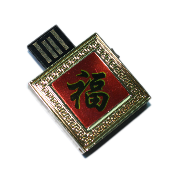第一款禮品u盤,金屬銅色外殼配以中國(guó)紅的福字u盤,老紅色背景顯示出穩(wěn)重,大氣,黑色油墨福字更顯中國(guó)文化,2013年送客戶更送福字u盤,象征福氣多多。