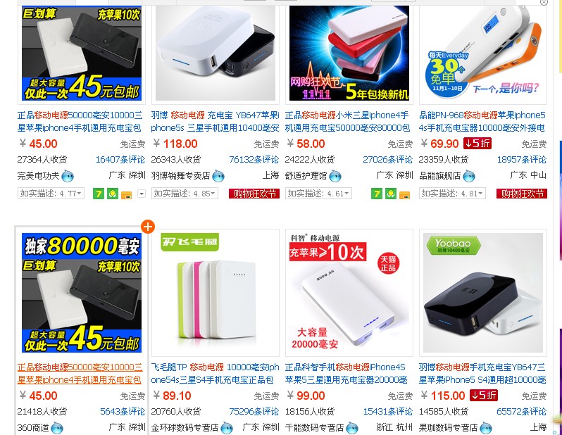 網(wǎng)購已成為一種時尚,而網(wǎng)上價格站打的非常激烈,很多手機(jī)移動電源品牌產(chǎn)品也不得不壓低自己的價格來博得消費(fèi)者的青睞。暴利多銷,成本低廉等等因素使得網(wǎng)絡(luò)成為了各種各樣商家必爭之道。我們看到下面圖中很多銷售量看起來非常好的,那么它就值得選購么?